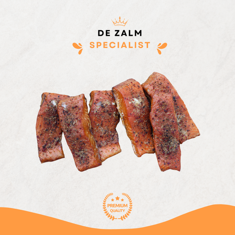 Onze gerookte zalm wordt op traditionele wijze gerookt met zorgvuldig geselecteerd hout voor een authentieke smaak.